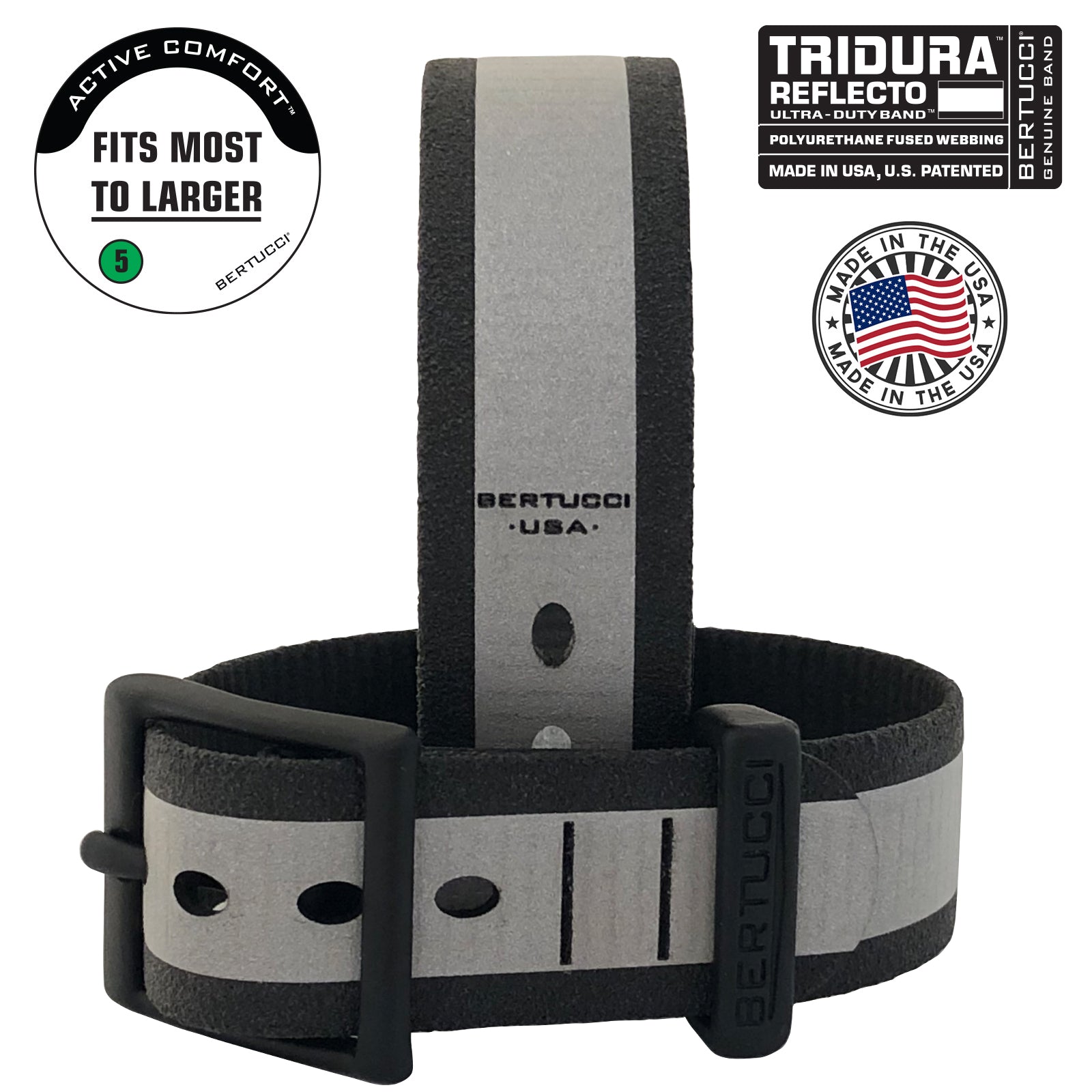The innovative Tridura Reflecto™ Ultra-Duty™ Band offers unmatched performance , durability and comfort. Made in the USA utilizing a U.S. Patented technology that heat fuses a polymer layer to a strong webbing core and a high performance reflective material inlay. This design is quick drying and eliminates tearing, fraying, cracking, splitting… typical issues with bands when worn during severe activities and environments. The reflective material  provides high visibility safety in low light conditions. Equipped with mil. spec. ultra rugged black powder coated steel buckle and keeper.